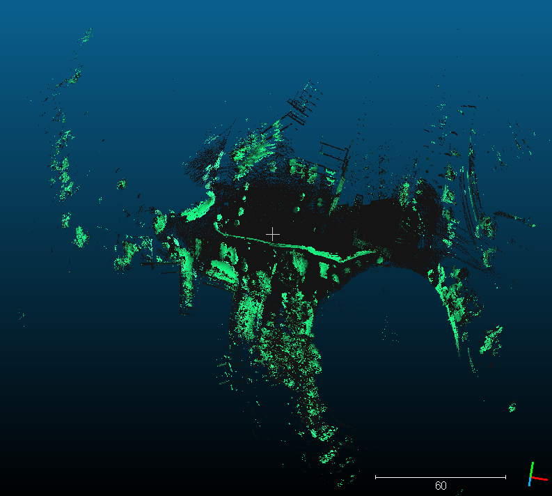 test.py를 실행해, 저장된 xyz 파일을 CloudCompare로 확인해 보면, 다음과 같이 녹색 점군이 흰색 점군으로 잘 정합되는 것을 확인할 수 있다.